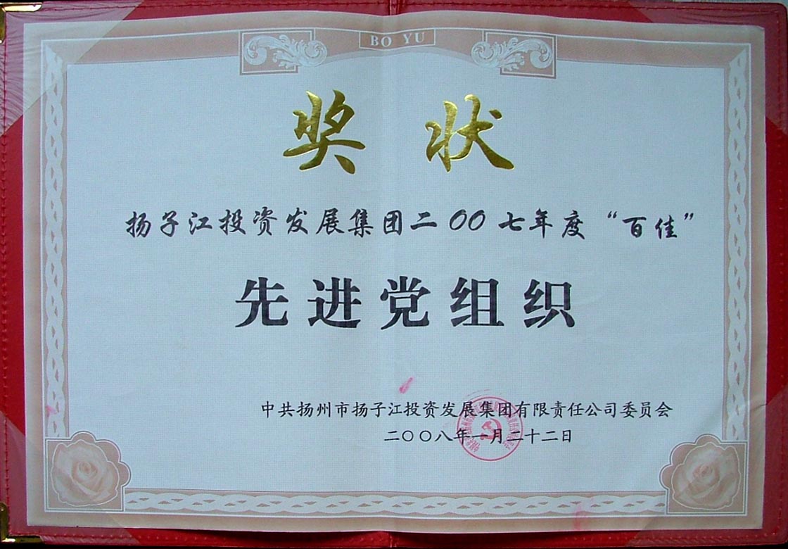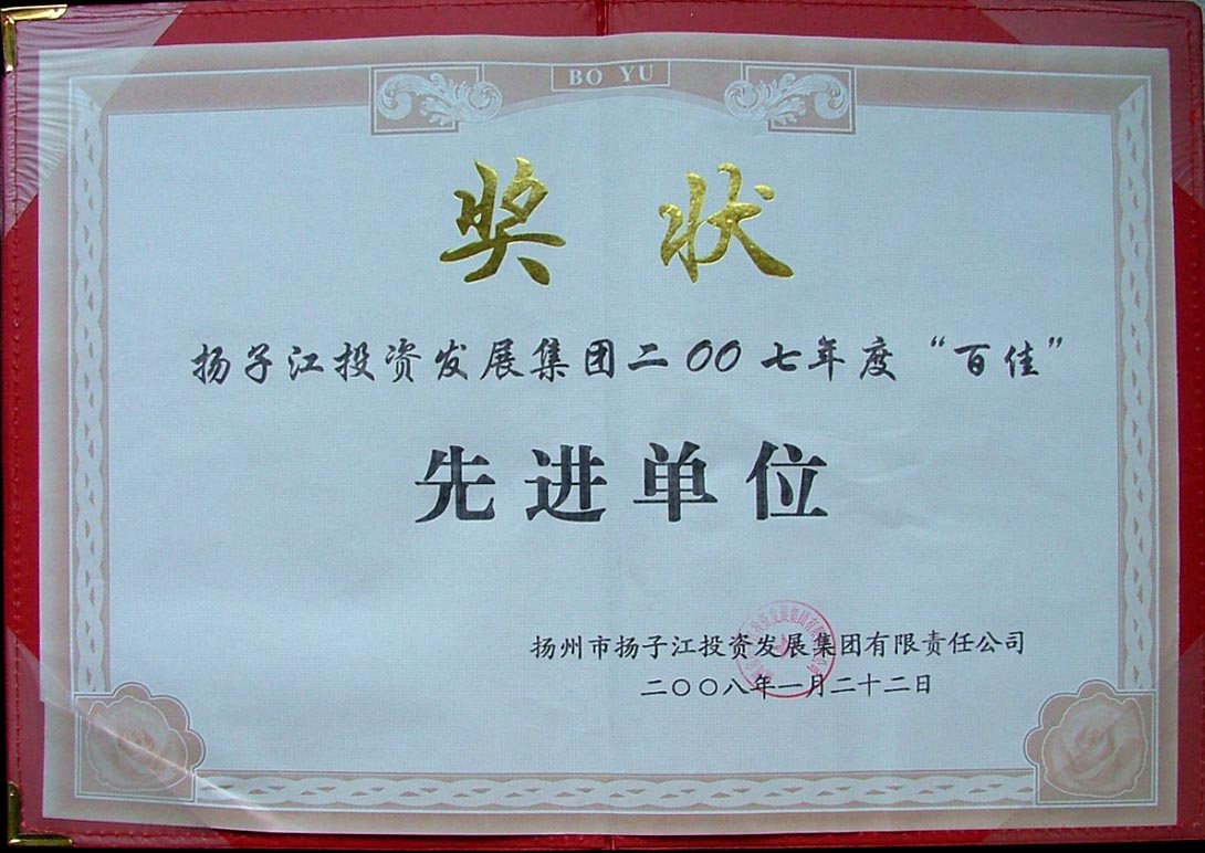 扬州商城被评为扬子江投资发展集团2007年度 “百佳”先进单位,扬州商城党总支被评为扬子江投资发展集团2007年度 “百佳”先进党组织。保安部消防警卫一班、五金型材市场五金区被评为先进班组;徐巧玲同志被评为优秀管理者;张萍同志被评为优秀妇女工作者;黄继红同志被评为优秀共产党员;周荣梅同志被评为优秀团员;李峰同志被评为优秀工会工作者;陈康同志被评为技术能手;杨爱国、冯松梅两位同志被评为文明职工。