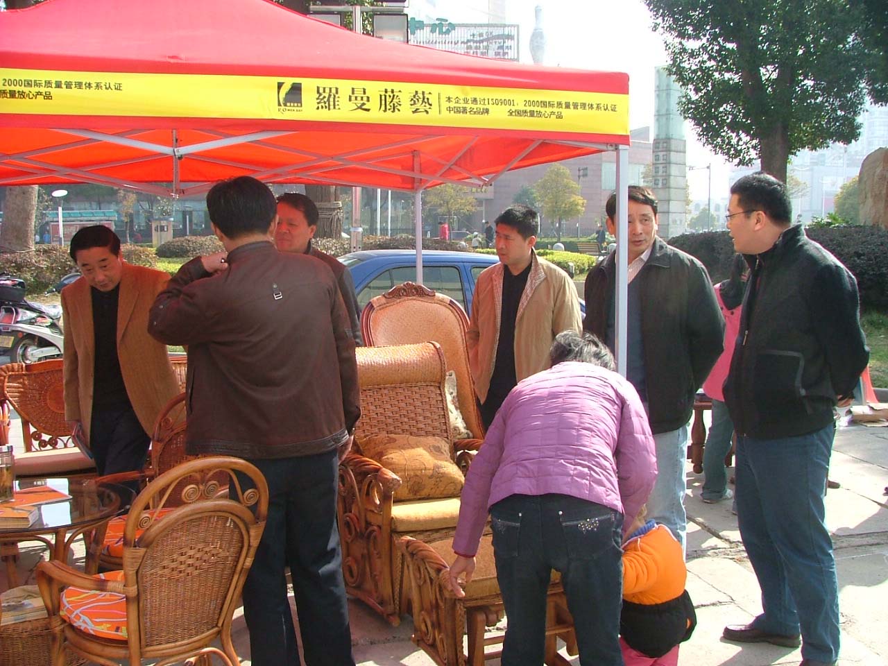 (图为商城总经理室张旭明、王余堂同志陪同开发区管委会、工商局领导参观特色藤艺家具)