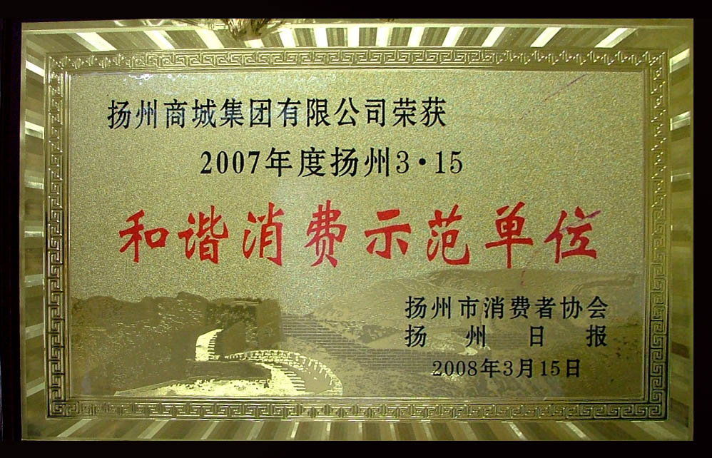 2008年3月15日下午,扬州消费者协会和《扬州日报》在京华城中城联合举办“2007年度扬州市和谐消费示范/满意单位”颁奖大会,扬州商城荣获“2007年度扬州市和谐消费示范/满意单位”称号。