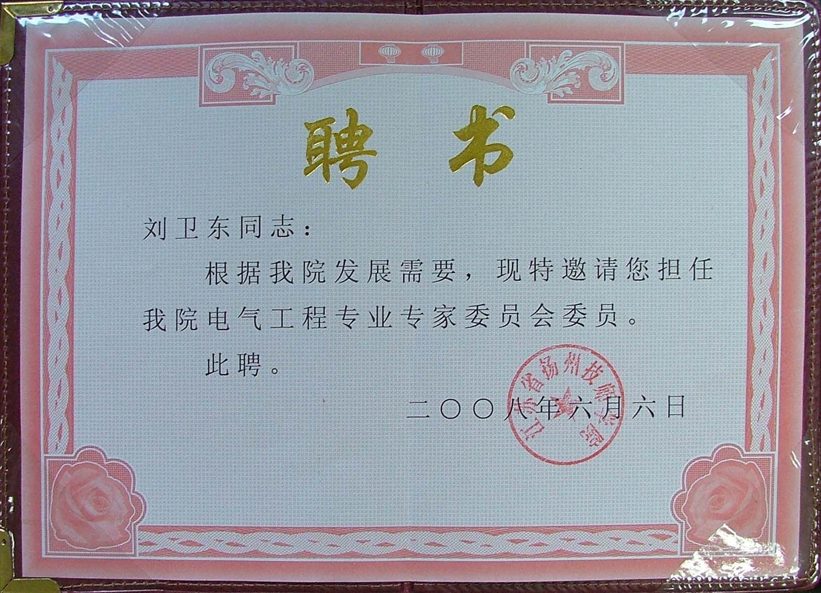 刘卫东同志被扬州技师学院聘为电气工程专业专家委员会委员
