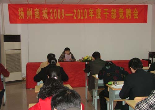 2009年3月25日,扬州商城集团有限公司组织了2009—2010年度二级部门干部竞聘演讲会。本次竞聘活动从3月16日公布方案、开始动员,共有33位同志报名参加22个二级部门职位的竞聘;3月23日总经理室对报名者进行了资格审查,33人均符合竞聘条件,随后,办公室深入各部门对竞聘者进行了民主测评,33人民主测评全部符合要求。