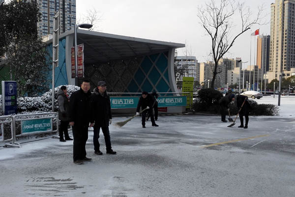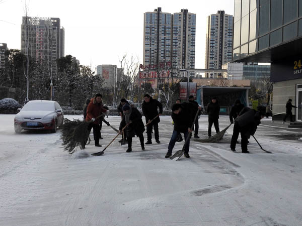 23日清晨7时,商城参加扫雪除冰的干部员工们就已经手拿铁锹、扫帚等工具或清扫门前积雪,或破除道路上的冰冻,大家不畏寒冷,不怕辛苦,齐心协力,边铲、边扫,认真清理商城区域的积雪,积雪很快被打扫成堆、清理干净,确保了商户和顾客的出入安全。